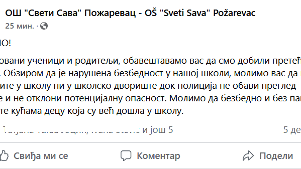 Kako Boom93 saznaje iz Policijske uprave Požarevac, većini osnovnih škola u okrugu jutros su stigle dojave o bombi, deca su poslata kući, a čeka se da policijske ekipe pregledaju škole.