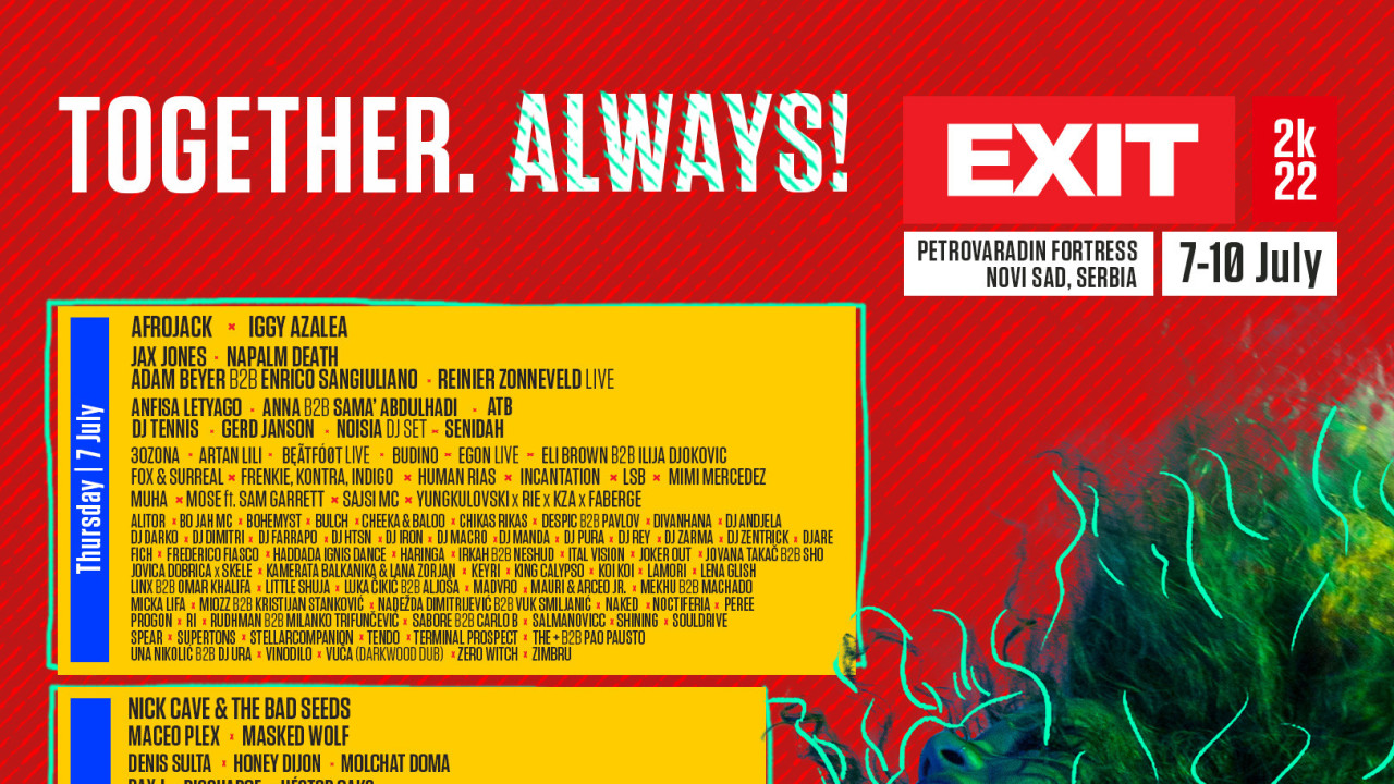 Četvorodnevni EXIT festival pod sloganom „Together. Always!“ održava se od četvrtka, 7. jula do nedelje, 10. jula u Novom Sadu na Petrovaradinskoj tvrđavi.
