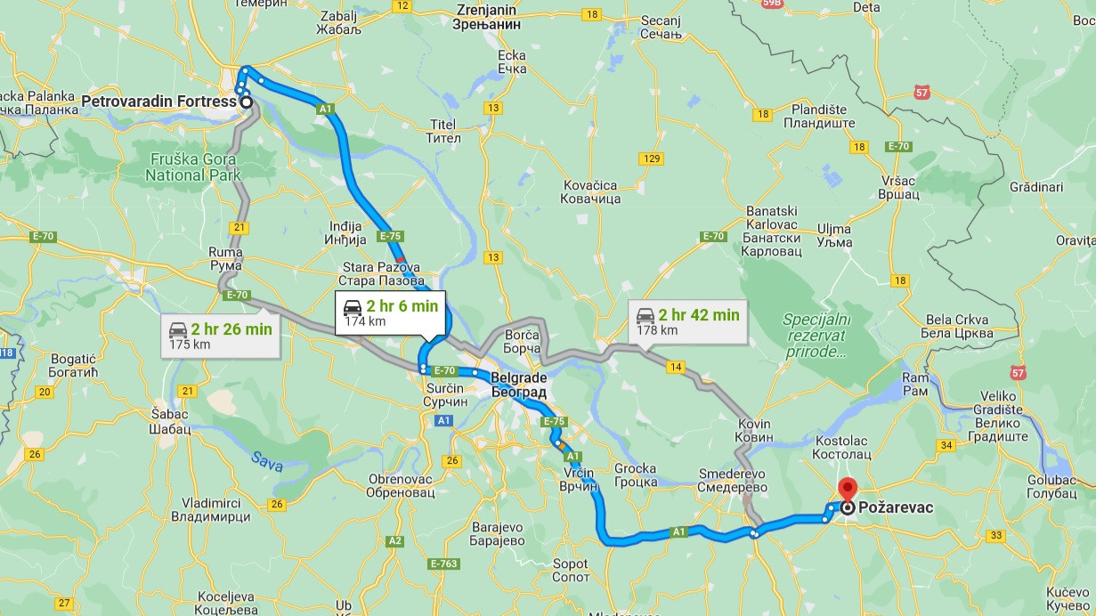 Ukoliko kolima putujete iz Požarevca do Petrovaradinske tvrđave biće vam potrebno 2h i 6minuta po informacijama koje su navedene na Google maps-u, a razdaljina iznosi 174km. Za ovaj način putovanja u oba pravca potrebno je izdvojiti oko 11.000 dinara, plus 840 dinara za putarine. Ovaj način putovanja isplativ je samo ukoliko na put kreće pet osoba koje će ravnomerno podeliti putne troškove.