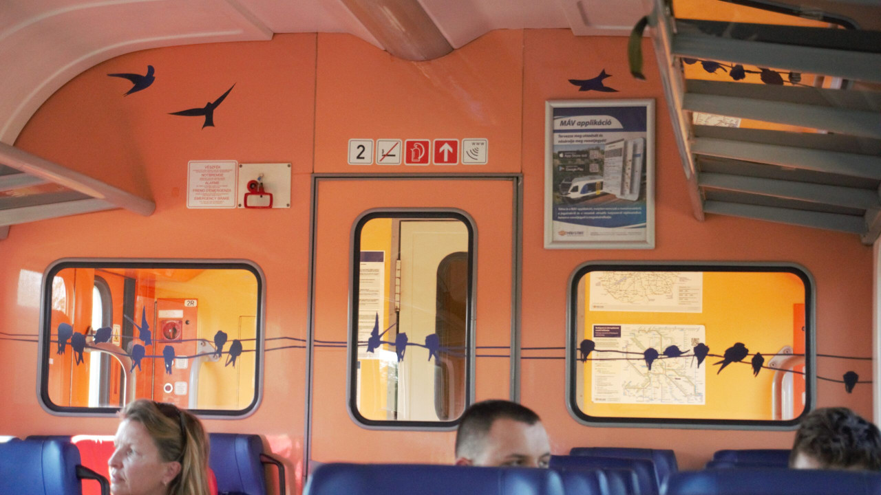Mape železničke linije Mađarske i Budimpešte ispisane su na mađarskom i engleskom jeziku u hodniku. Pre dolaženja na stanicu, oglašava se kratak džingl i prijatan ženski glas izgovara ime sledeće stanice od koje sam razumela samo poslednji deo – “salaš”. Još jednom dve kondukterke, od kojih je jedna, izgleda, pripravnica, proveravaju karte putnika.