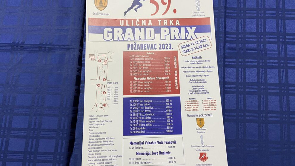 U sredu 11.10.2023. godine pod pokroviteljstvom Grada Požarevca, a u organizaciji Sportskog saveza Grada Požarevca, održava ulična 59. GRAND PRIX „Požarevac 2023“
