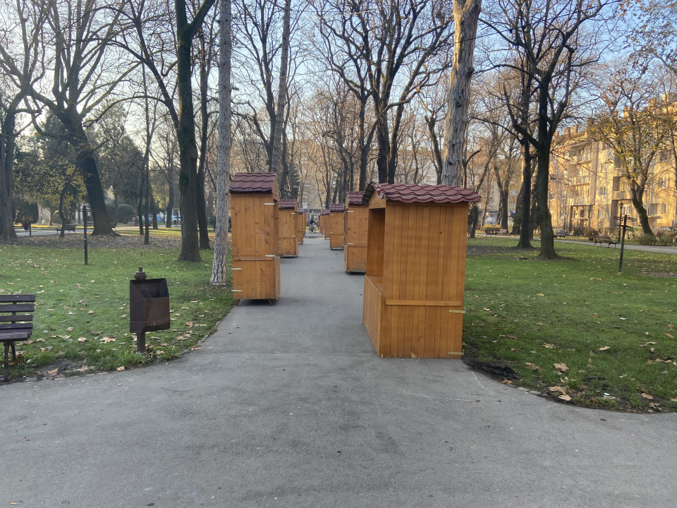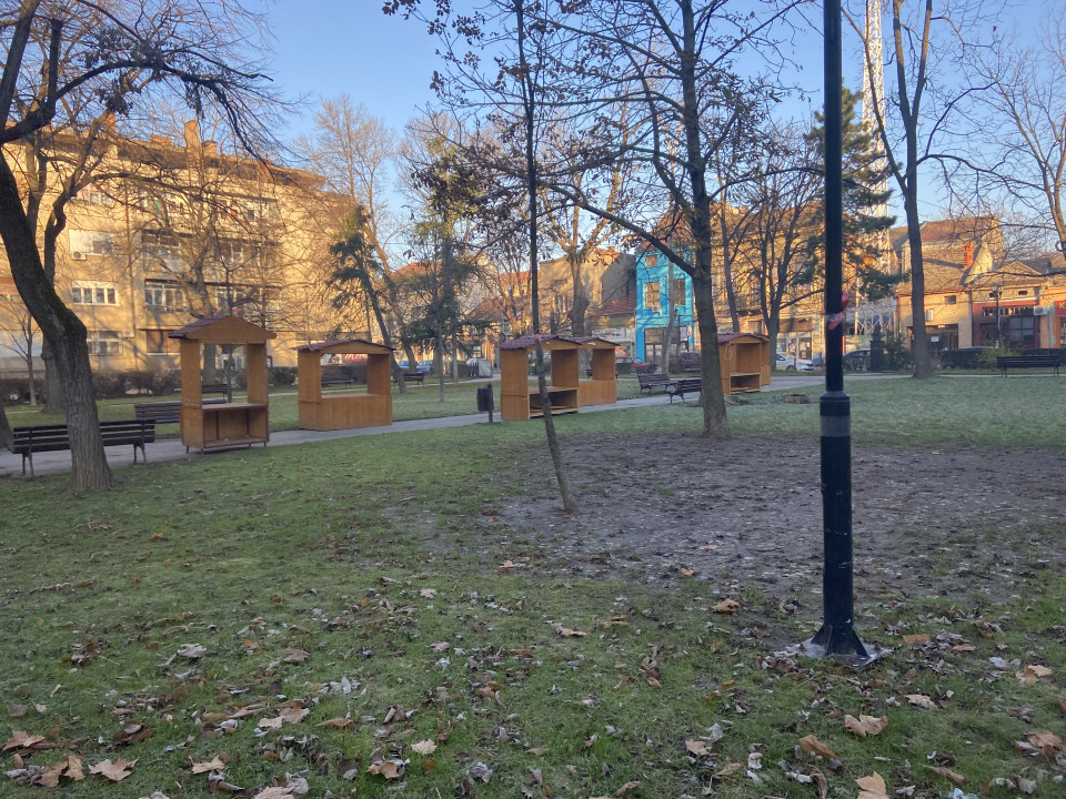 U Gradskom parku juče su postavljene drvene kućice na kojima će prodavci izlagati proizvode u okviru novogodišnjeg i božićnog vašara. Prodavaca još nema i vašar još uvek nije počeo.