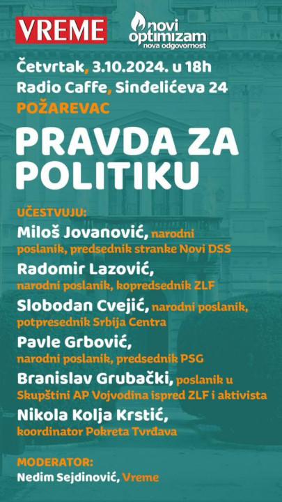 U četvrtak, 3. oktobra, u Požarevcu će biti održana tribina "Pravda za politiku" u organizaciji nedeljnika "Vreme".