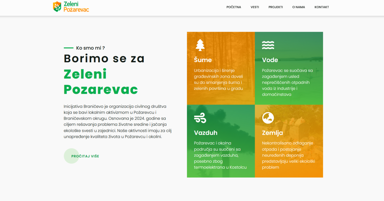 zelenipozarevac.rs je onlajn platforma udruženja “Inicijativa Braničevo” koja je namenjena zaštiti i očuvanju životne sredine i ekologiji na teritoriji našeg grada. Ova platforma je od velikog značaja u vreme kada se ekološki problemi postavljaju u centar pažnje, a potreba za zaštitom životne sredine postaje sve očiglednija.
