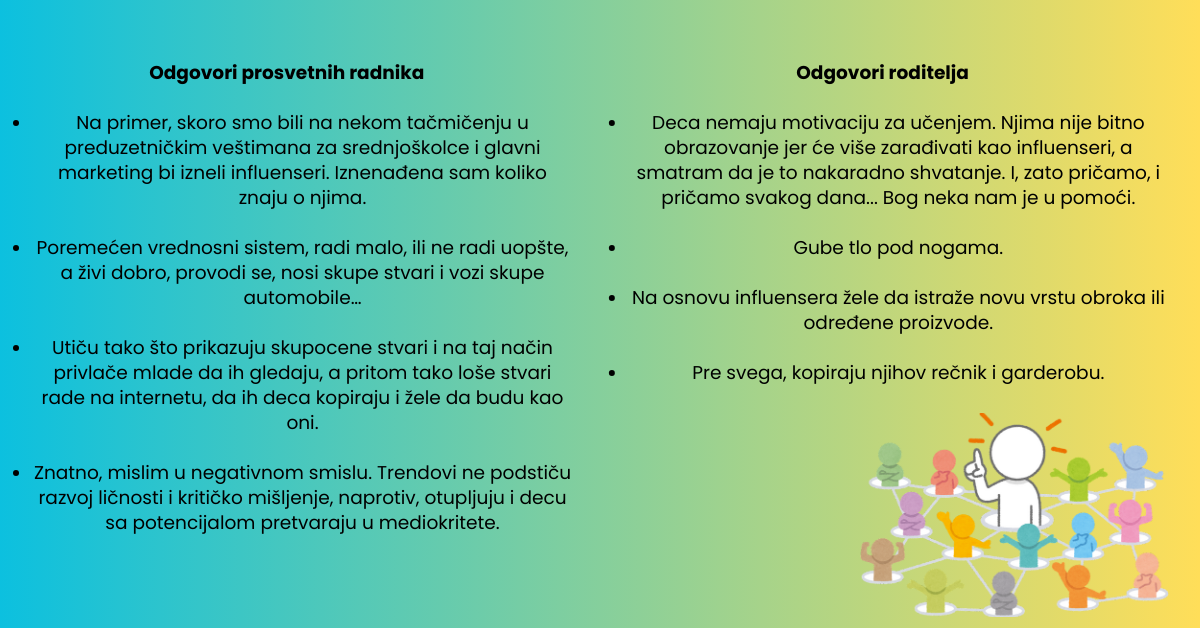 Kada su u pitanju influenseri, za koje odrasli smatraju da imaju loš uticaj, učenici su kroz svoje odgovore pokazali kritičko mišljenje i svest da influenseri imaju veliki uticaj, ali da ih ne koristi svaki influenser u dobre svrhe.