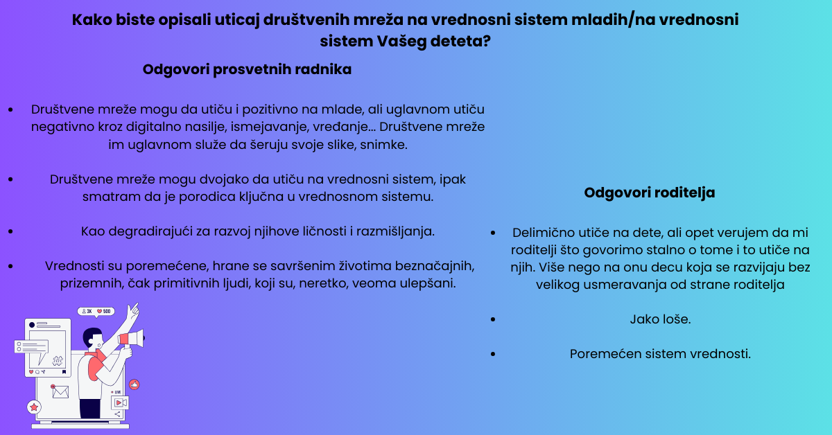 Prosvetne radnike i roditelje pitali smo kako bi opisali uticaj društvenih mreža na vrednosni sistem mladih, odnosno vrednosni sistem njihovog deteta.