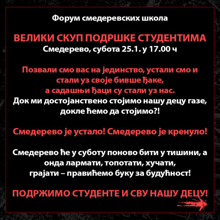 Prosvetni radnici okupljeni u organizaciji "Forum smederevskih škola" pozvali su građane na veliki skup podrške studentima, koji će se održati u Smederevu u subotu, 25. januara, s početkom u 17 časova. Okupljanje učesnika biće ispred smederevske Gimnazije, nakon čega će, posle 15 minuta tišine u znak sećanja na poginule u Novom Sadu, uslediti protestna šetnja glavnim ulicama Smedereva.