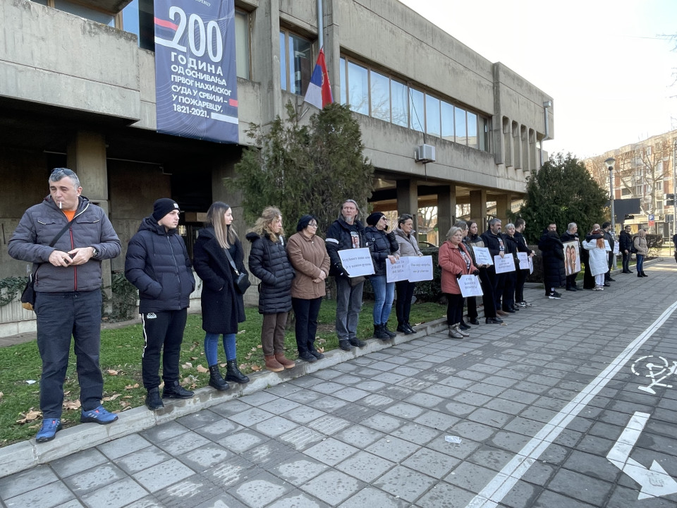 Pre početka suđenja, ispred Višeg suda u Požarevcu, ponovo su se okupili roditelji, rodbina i prijatelji nastradalih, organizujući miran protest. Okupljeni su ponovo ukazali na potrebu za strožijim kaznama za vozače koji ugrožavaju živote drugih učesnika u saobraćaju, smatrajući da trenutni zakoni nisu dovoljni da spreče ovakve tragedije. Držali su transparente sa porukama poput: "Stop vožnji pod dejstvom narkotika", "Stop bahatim vozačima", "Ovo nije nesreća, ovo je ubistvo", "Pravda za Jovanu i Filipa", "Budućnost naše dece je u vašim rukama", "Stop vožnji u alkoholisanom stanju", i "Voziti 200 na sat nije nesreća".