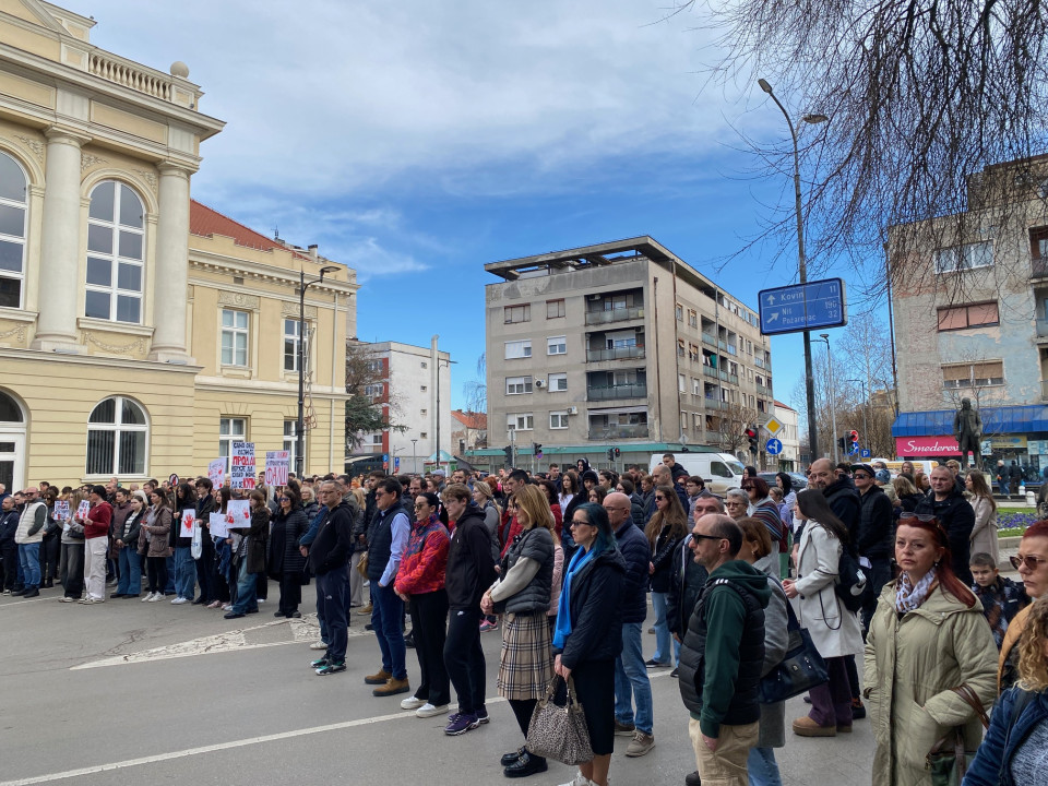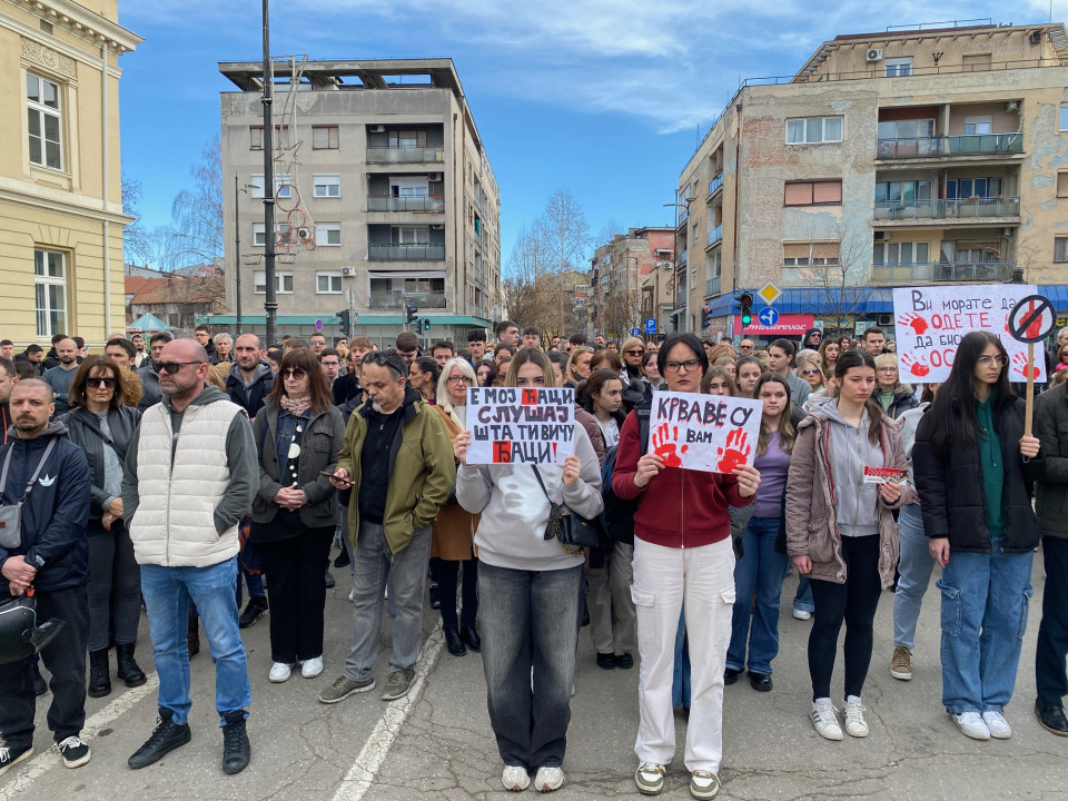 Učenicima su se na blokadi pridružili prosvetni radnici i građani.
