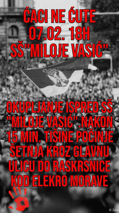 Kako organizatori najavljuju okupljanje je ispred Srednje škole "Miloje Vasić" u 18 časova.