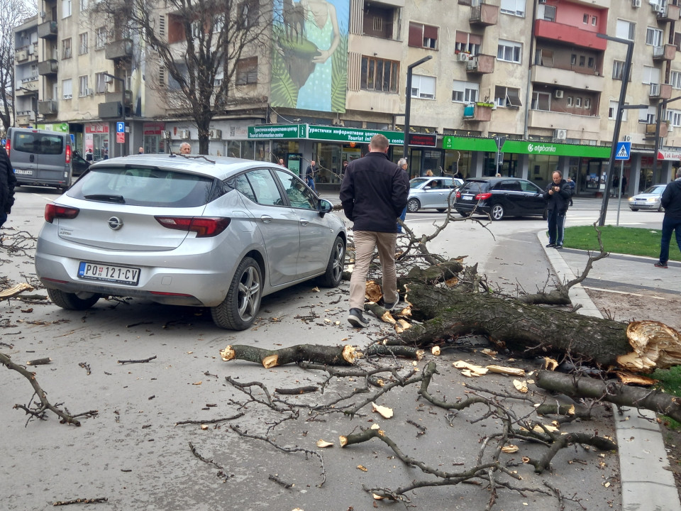 Deblji deo grane završio je na kolovozu, dok je ostatak pao na vozilo u pokretu i probio šoferšajbnu.