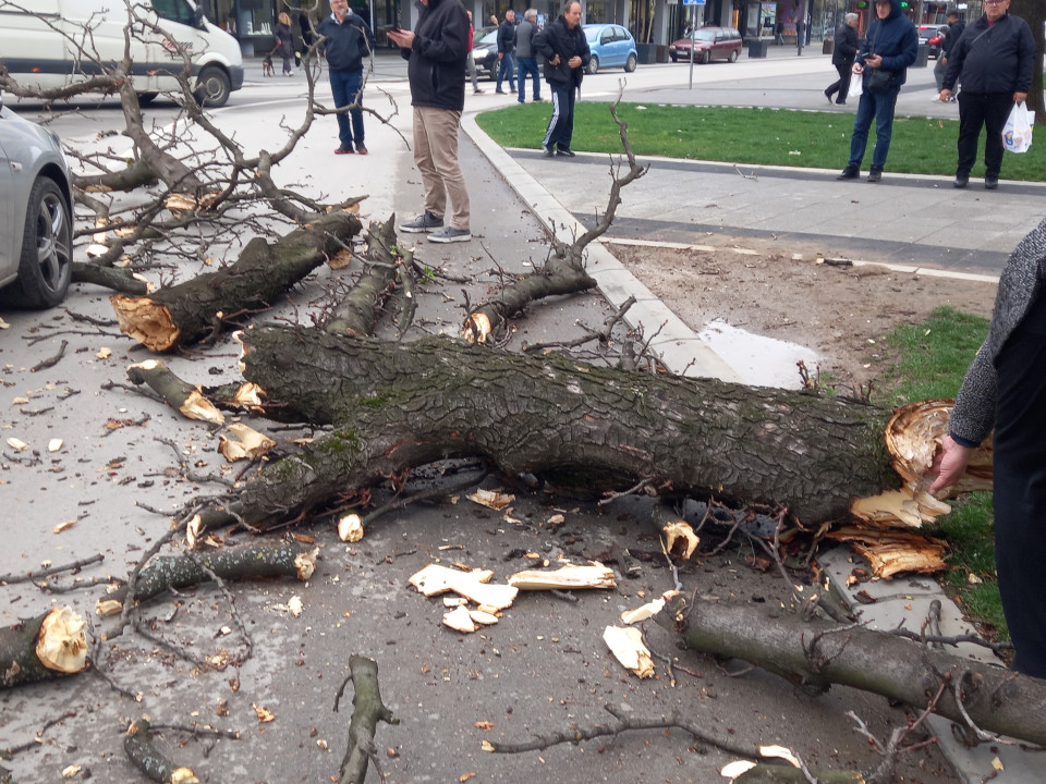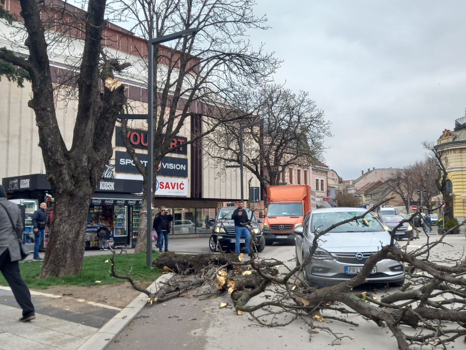 Dok se automobil kretao kružnim tokom na Trgu oslobođenja, velika grana je pukla i pala direktno na šoferšajbnu. Sreća, izbegnuta je veća tragedija.