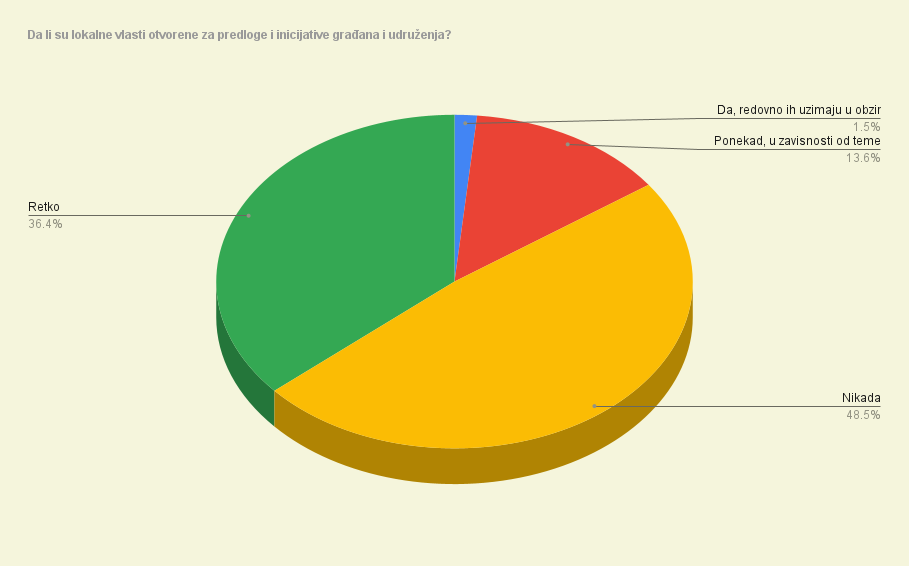 Rezultati ankete o odnosu vlasti prema udruživanju građana i civilnom društvu, koju je popunilo ukupno 66 ispitanika, ukazuju na jasno izraženu želju građana za većom saradnjom sa lokalnom upravom, ali i na nepoverenje u postojeće mehanizme podrške.