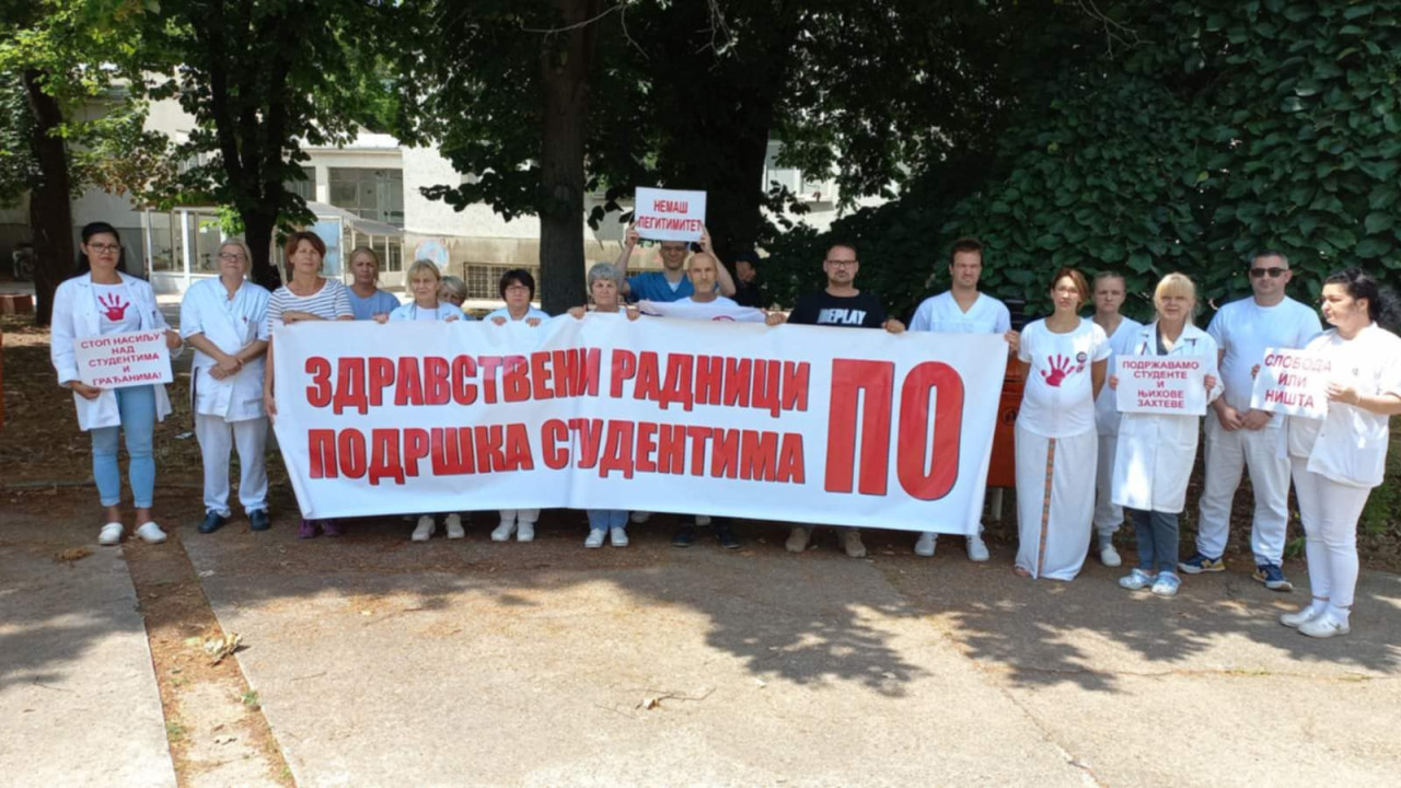 Zdravstveni radnici se svakog petka počev od januara okupljaju u dvorištu bolnice kako bi studentima pružili podršku u njihovoj borbi.