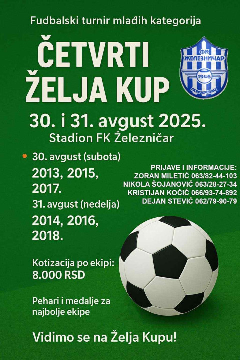 Na stadionu Fudbalskog kluba Željezničar poslednjeg vikenda avgusta održaće se četvrti po redu turnir mlađih kategorija pod nazivom „Želja kup“, koji i ove godine okuplja veliki broj talentovanih mališana iz različitih generacija.