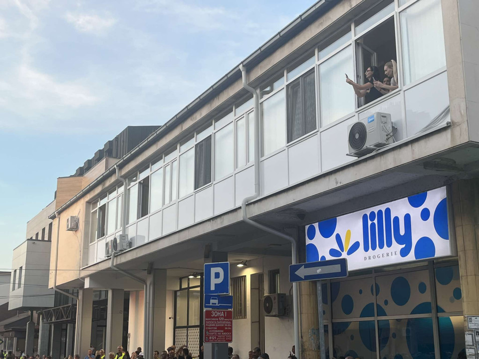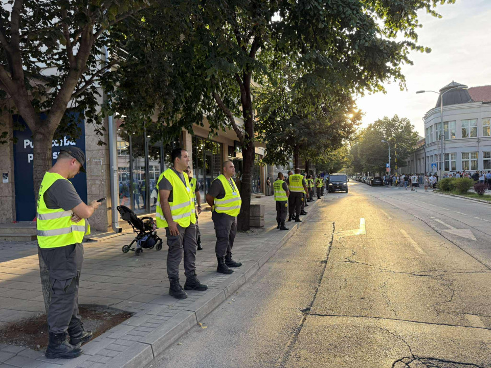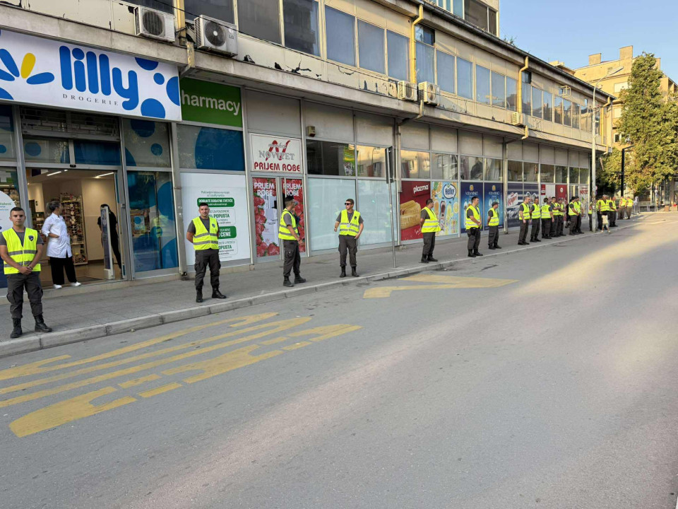 Prisutna je policija u uniformi i policija u civilu, kao i dva interventna vozila i dva vozila saobraćajne policije.