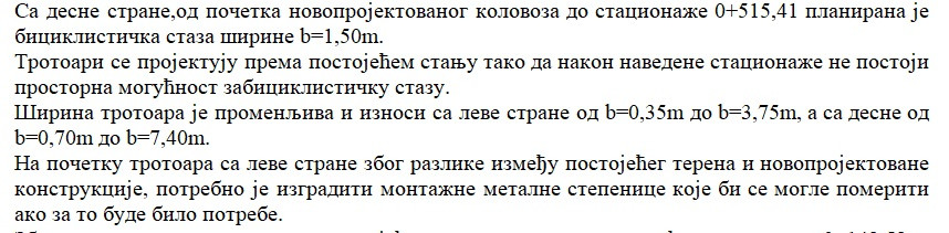 Prema tehničkoj dokumentaciji, biciklistička staza širine 1,5 metara predviđena je sa desne strane ulice, od početka trase do stacionaže 0+515,41, navodi se u dokumentu. Nakon te tačke, kako stoji u dokumentaciji, "ne postoji prostor za biciklističku stazu".