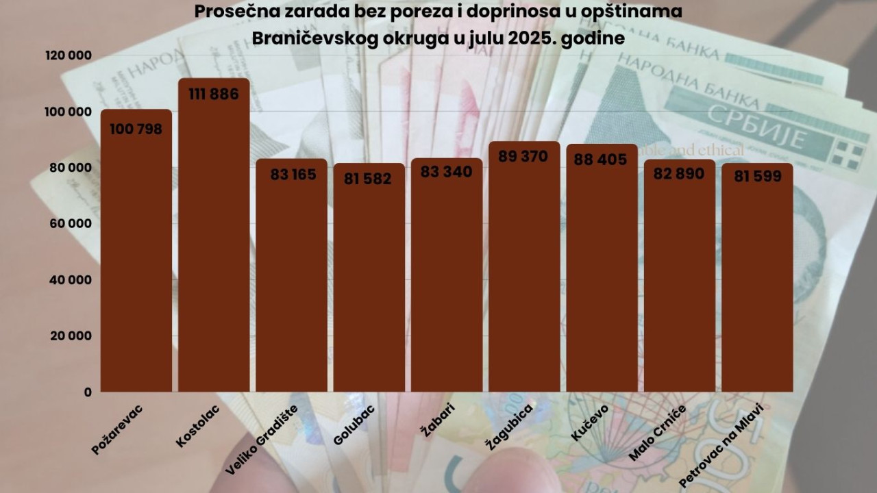 Prosečna zarada na nivou celog Braničevskog okruga u julu je iznosila 94 854 dinara, što je za skoro 3 000 više u odnosu na prethodni mesec, kada je iznosila 91 903 dinara.
