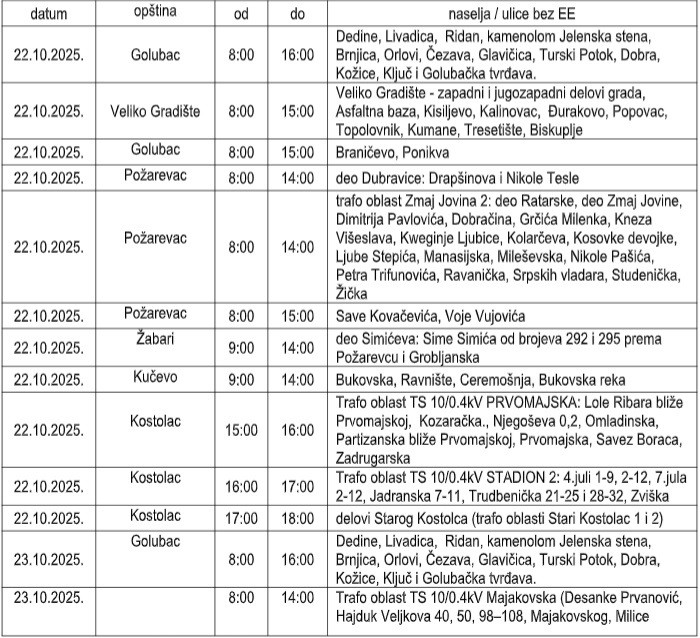 Informacije o planiranim isključenjima dostupne su na sajtu www.elektrodistribucija.rs, preko mobilne aplikacije. Na broj kontakt centra 0800 360 300 (opcija 5) možete dobiti informacije o planiranim isključenjima ili prijaviti kvar za ED Požarevac.