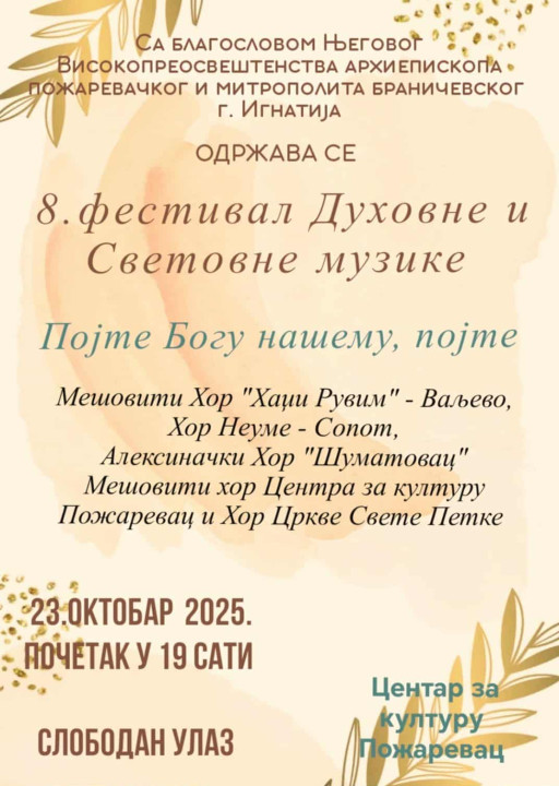 U organizaciji Centra za kulturu Požarevac, 23. oktobra biće održan osmi po redu festival duhovne i svetovne muzike.