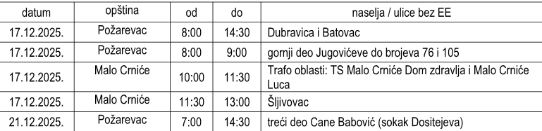 Elektrodistribucija Srbije d.o.o. Beograd kontinuirano radi na unapređenju pouzdanosti i stabilnosti snabdevanja električnom energijom. Najveći deo radova je organizovan bez isključenja krajnjih kupaca. Neke aktivnosti nije moguće sprovesti bez obustave napajanja, zbog obezbeđenja bezbednih uslova za rad naših zaposlenih. Korisnike molimo za razumevanje.