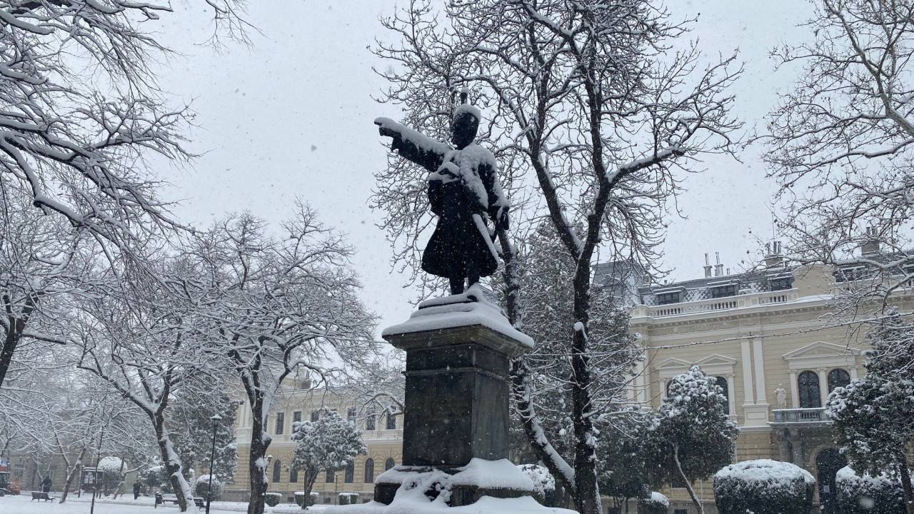 Spomenik knezu Milošu Obrenoviću u Gradskom parku jutros je osvanuo prekriven snegom.