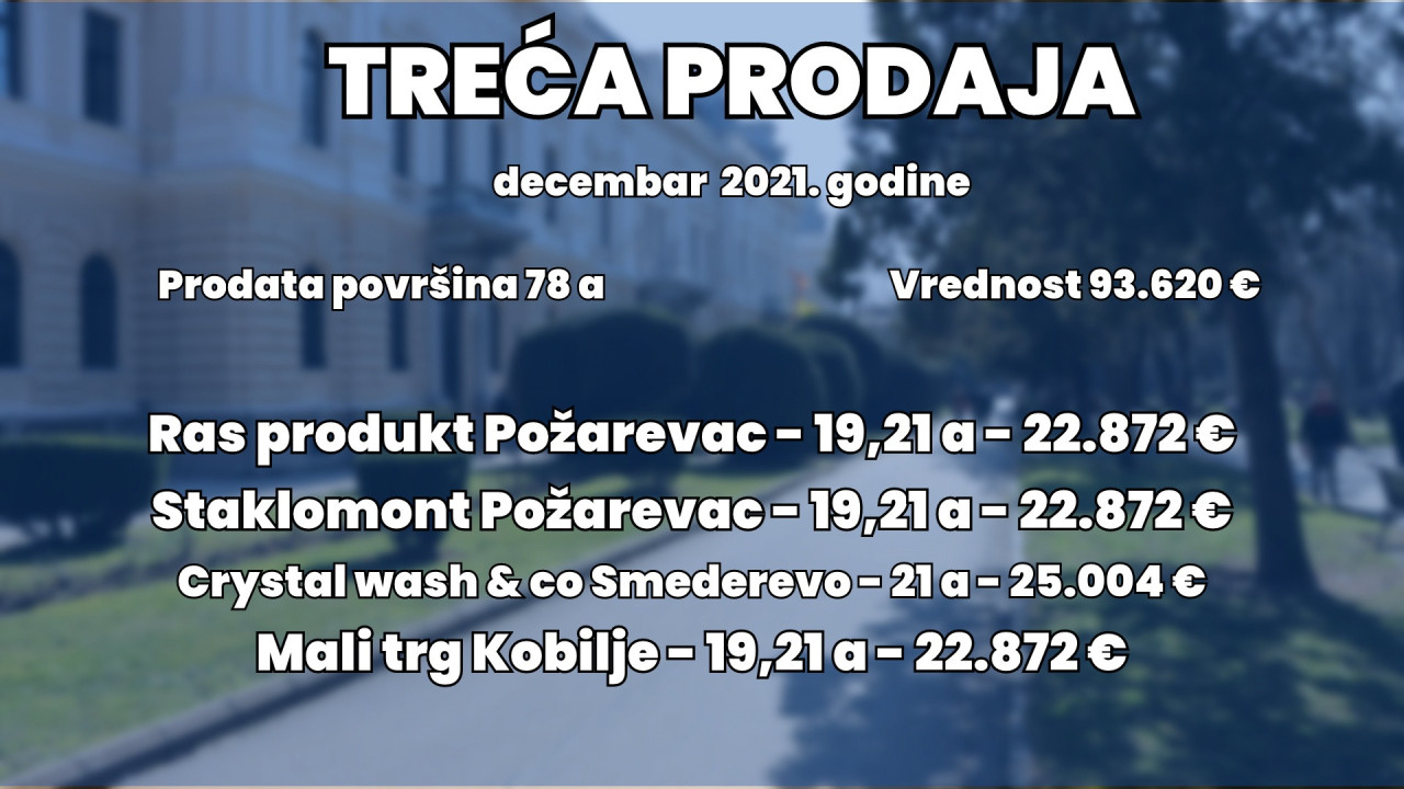 Krajem 2021. godine prodate su još četiri parcele u vrednosti od oko 93.620 evra koje obuhvataju površinu od oko 78 ara, a parcele su kupila dva preduzeća iz Požarevca, Ras produkt i Staklomont, kao i preduzeće Crystal wash & Co iz Smedereva i Mali trg iz Kobilja.